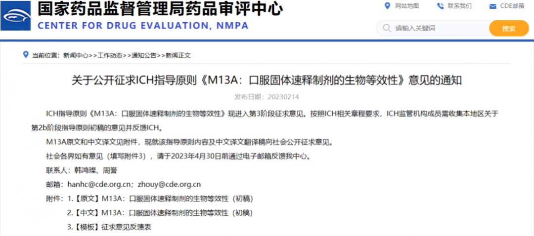 關(guān)于公開征求ICH指導(dǎo)原則《M13A:口服固體速釋制劑的生物等效性》意見的通知