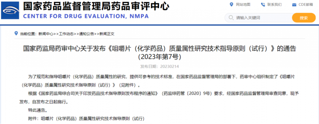 國(guó)家藥監(jiān)局藥審中心關(guān)于發(fā)布《咀嚼片(化學(xué)藥品)質(zhì)量屬性研究技術(shù)指導(dǎo)原則(試行)》的通告(2023年第7號(hào))