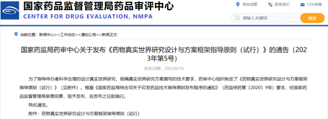 國(guó)家藥監(jiān)局藥審中心關(guān)于發(fā)布《藥物真實(shí)世界研究設(shè)計(jì)與方案框架指導(dǎo)原則(試行)》的通告(2023年第5號(hào))