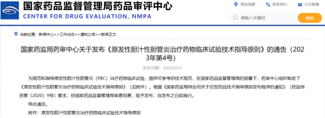 國(guó)家藥監(jiān)局藥審中心關(guān)于發(fā)布《原發(fā)性膽汁性膽管炎治療藥物臨床試驗(yàn)技術(shù)指導(dǎo)原則》的通告(2023年第4號(hào))