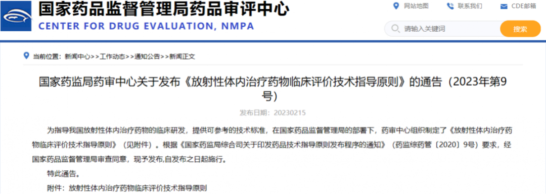 國(guó)家藥監(jiān)局藥審中心關(guān)于發(fā)布《放射性體內(nèi)治療藥物臨床評(píng)價(jià)技術(shù)指導(dǎo)原則》的通告(2023年第9號(hào))