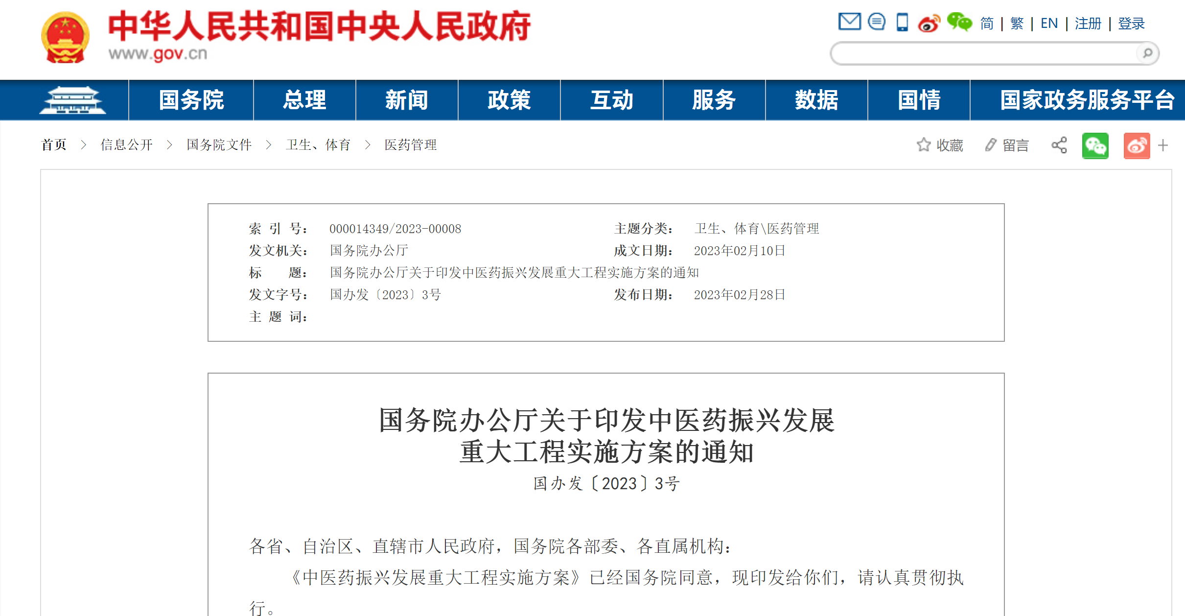 國(guó)務(wù)院辦公廳關(guān)于印發(fā)中醫(yī)藥振興發(fā)展重大工程實(shí)施方案的通知