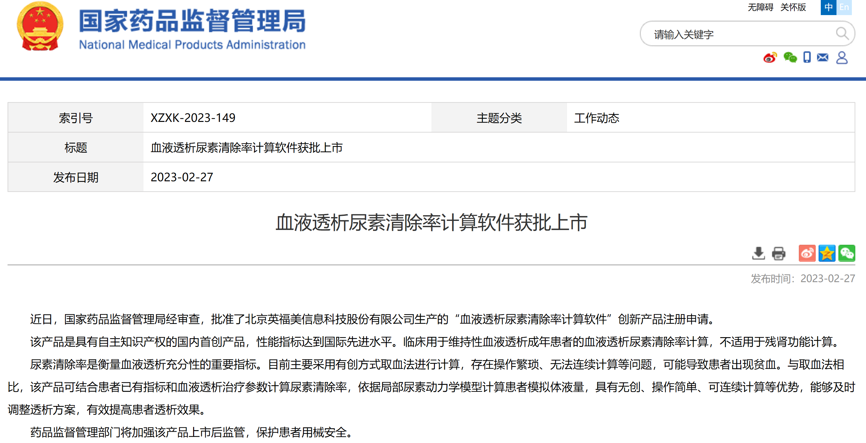 血液透析尿素清除率計(jì)算軟件獲批上市