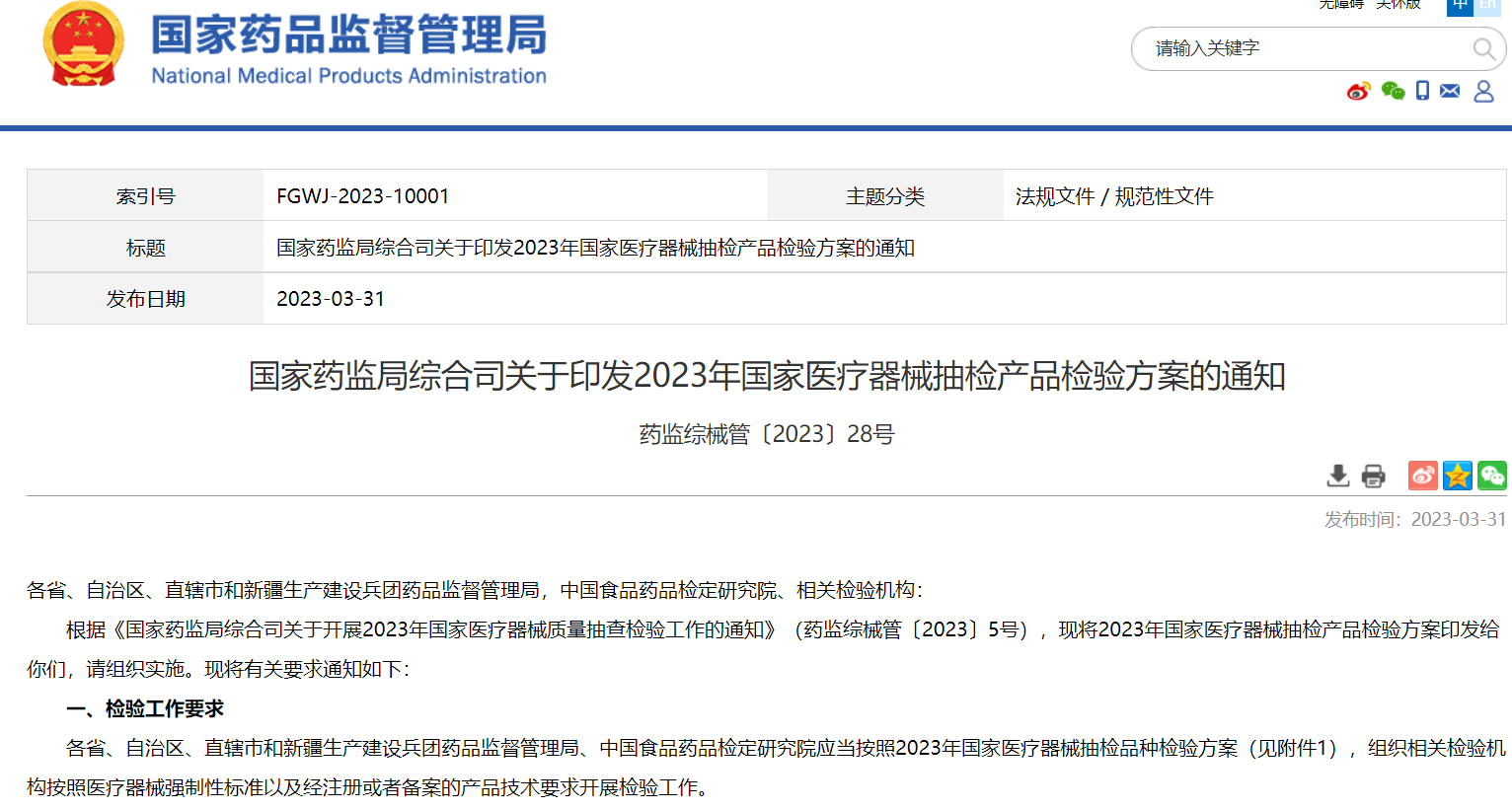 國家藥監(jiān)局綜合司關(guān)于印發(fā)2023年國家醫(yī)療器械抽檢產(chǎn)品檢驗(yàn)方案的通知