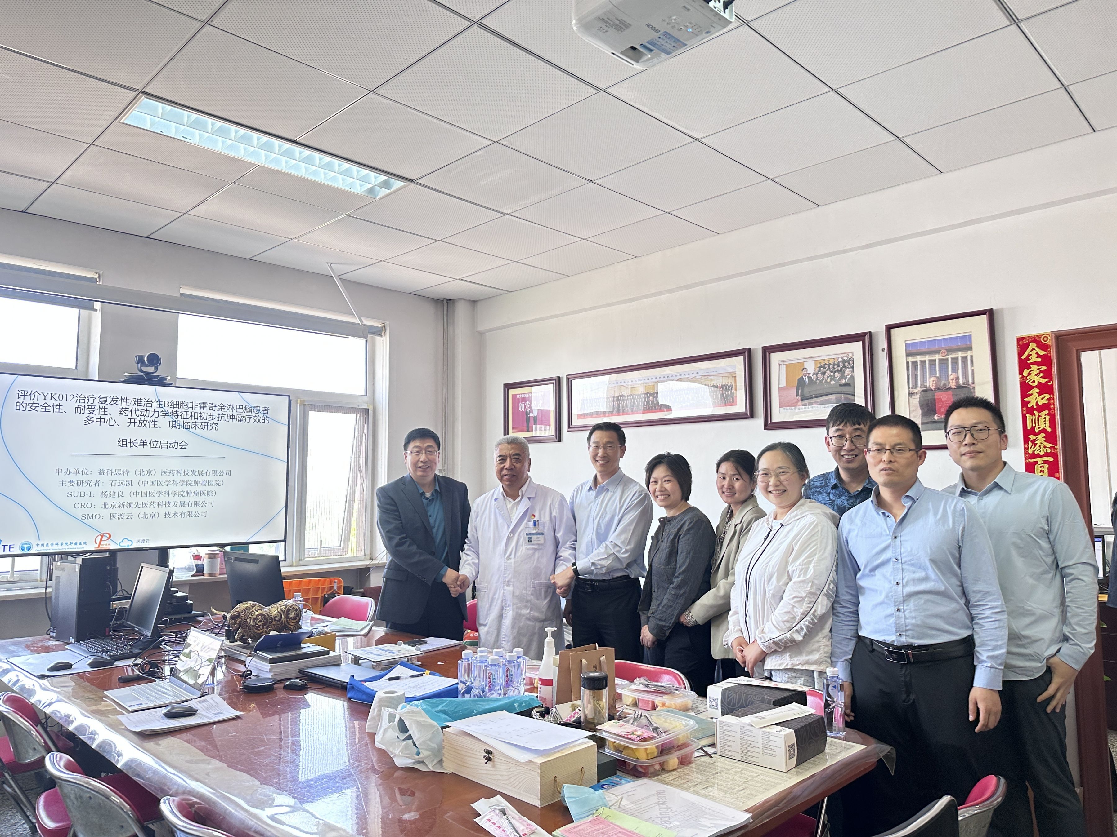 ▲ 中國醫(yī)學科學院腫瘤醫(yī)院臨床研究中心副院長、腫瘤內(nèi)科主任石遠凱教授(左2),益科思特(北京)醫(yī)藥科技發(fā)展有限公司聯(lián)合創(chuàng)始人孟慶武先生(左1)和聯(lián)合創(chuàng)始人袁清安博士(左3),北京新領(lǐng)先醫(yī)藥臨床事業(yè)部運營總監(jiān)潘麗怡女士(左4),申辦方臨床副總監(jiān)任沖(右3)及CRO方醫(yī)學總監(jiān)袁少雄女士(右4))團隊代表等啟動會現(xiàn)場合影