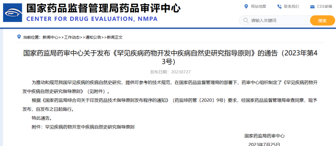 國(guó)家藥監(jiān)局藥審中心關(guān)于發(fā)布《罕見疾病藥物開發(fā)中疾病自然史研究指導(dǎo)原則》的通告(2023年第43號(hào))