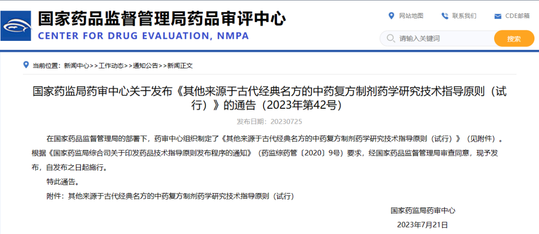 國(guó)家藥監(jiān)局藥審中心關(guān)于發(fā)布《其他來(lái)源于古代經(jīng)典名方的中藥復(fù)方制劑藥學(xué)研究技術(shù)指導(dǎo)原則(試行)》的通告(2023年第42號(hào))