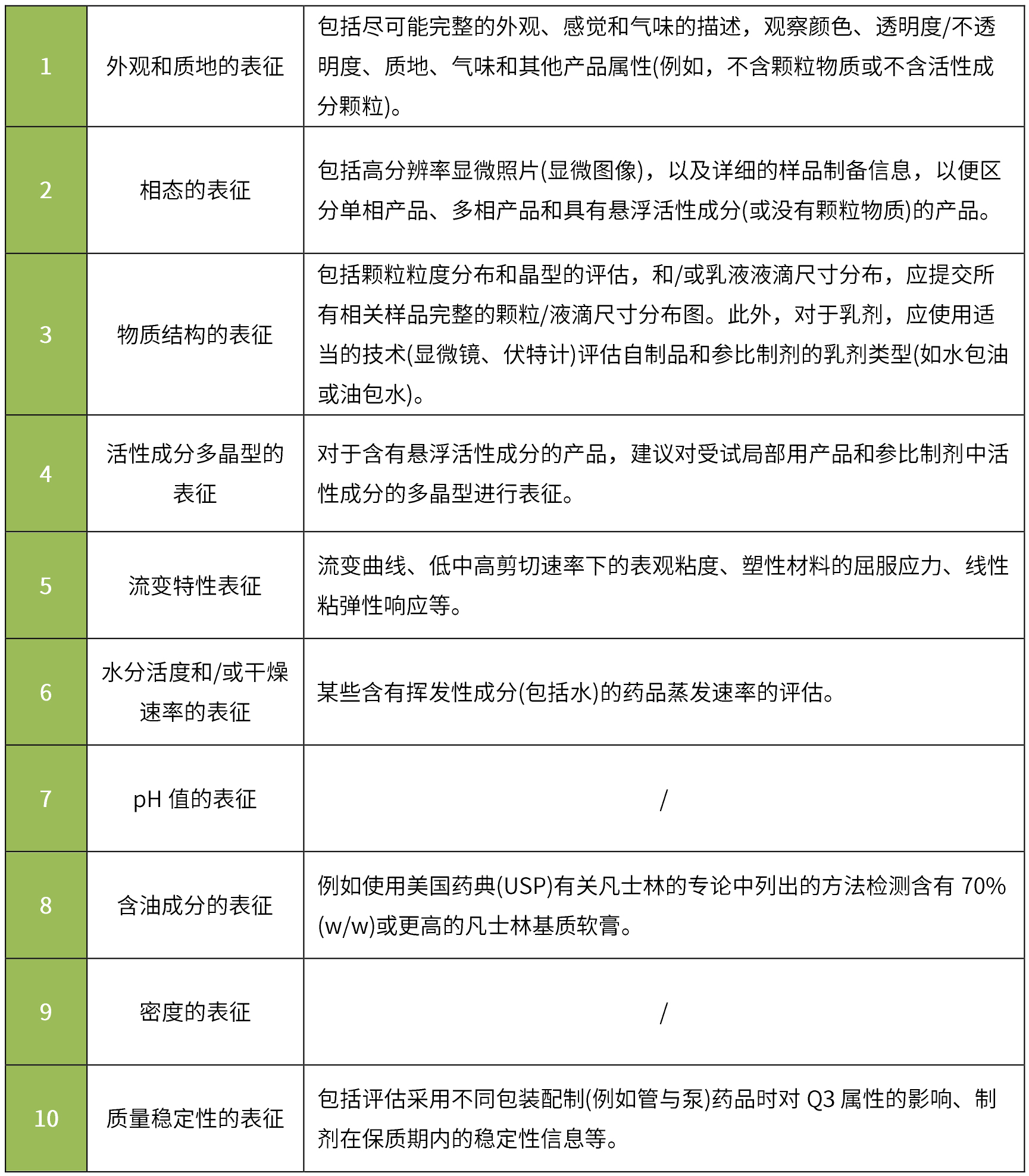 根據(jù)《Physicochemical and Structural (Q3) Characterization of Topical Drug Products Submitted in ANDAs Guidance for Industry》:通常建議申請(qǐng)人對(duì)照參比制劑對(duì)其申請(qǐng)的仿制藥進(jìn)行Q3特性比較,并提供可接受的體外釋放試驗(yàn)(IVRT)和體外滲透試驗(yàn)(IVPT)的證明。其中基本Q3表征通常包括: