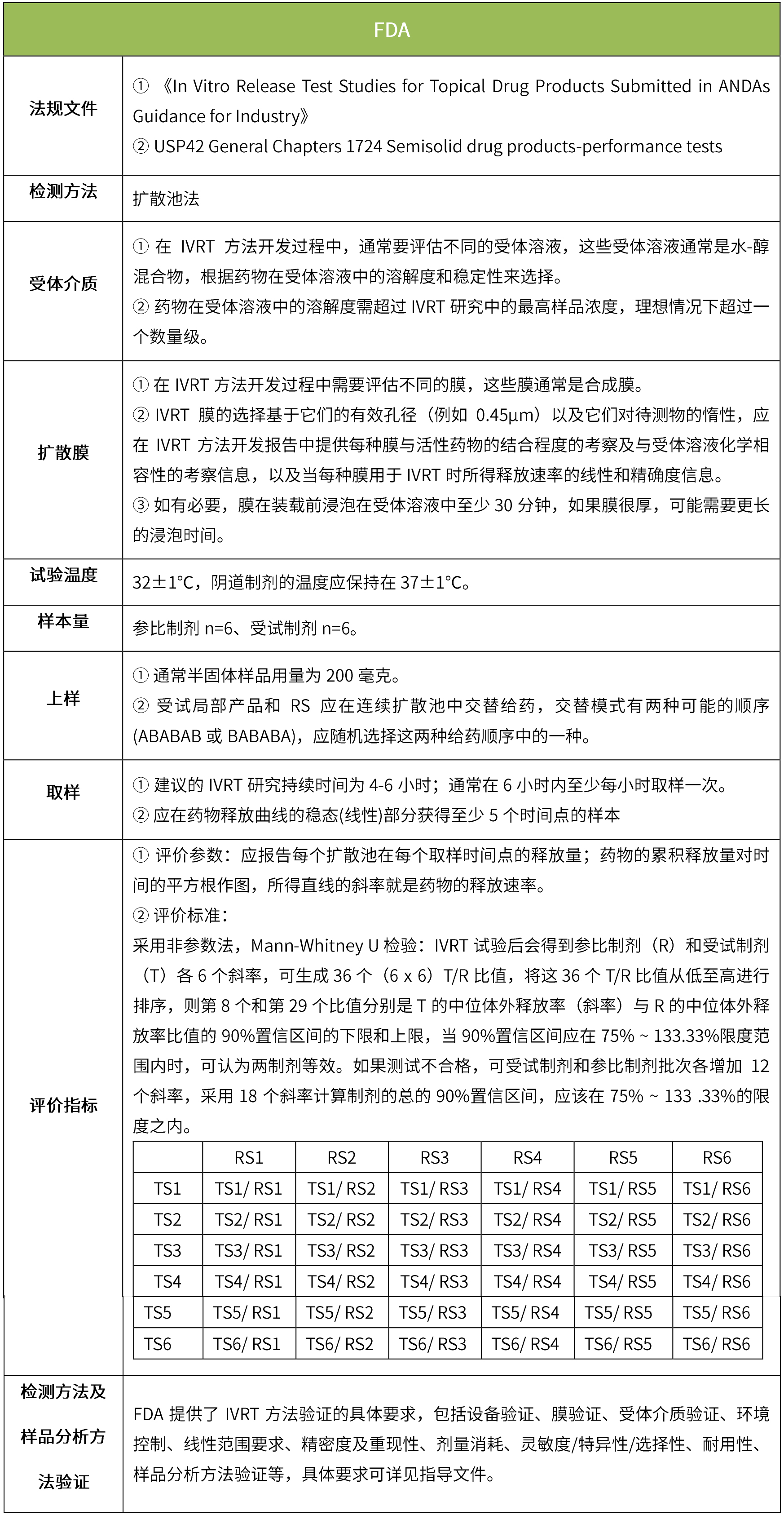 下表匯總了各國(guó)法規(guī)對(duì)IVRT的評(píng)價(jià)要求??傮w而言,各國(guó)對(duì)試驗(yàn)過(guò)程的要求很多都是相同的,評(píng)價(jià)標(biāo)準(zhǔn)則不同,中國(guó)的評(píng)價(jià)標(biāo)準(zhǔn)在18年征求意見(jiàn)稿時(shí)與FDA一致,試行版則只提及參考FDA、EMA、PMDA,歐盟和日本的評(píng)價(jià)標(biāo)準(zhǔn)與FDA也不一致。