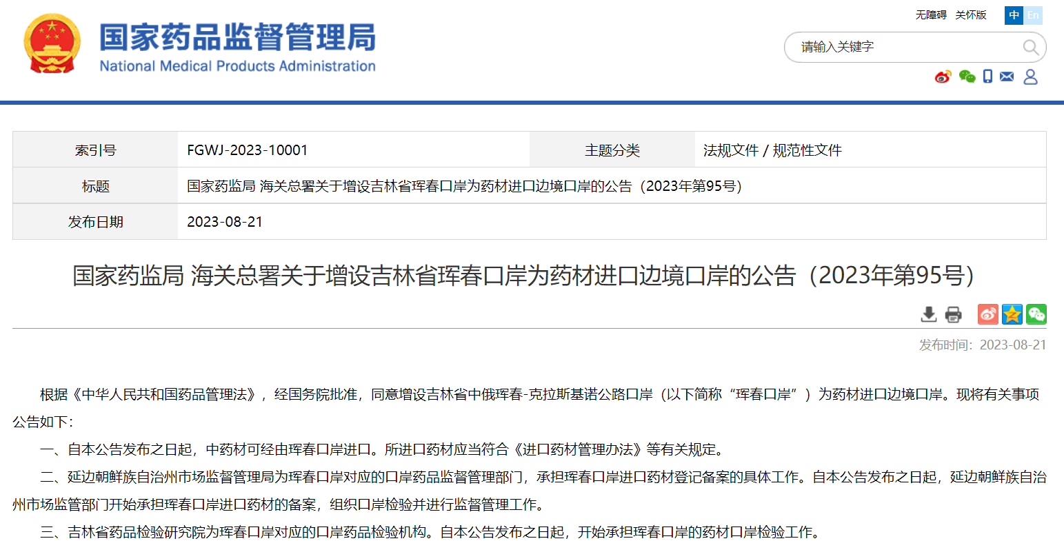 國家藥監(jiān)局海關(guān)總署關(guān)于增設(shè)吉林省琿春口岸為藥材進(jìn)口邊境口岸的公告(2023年第95號)