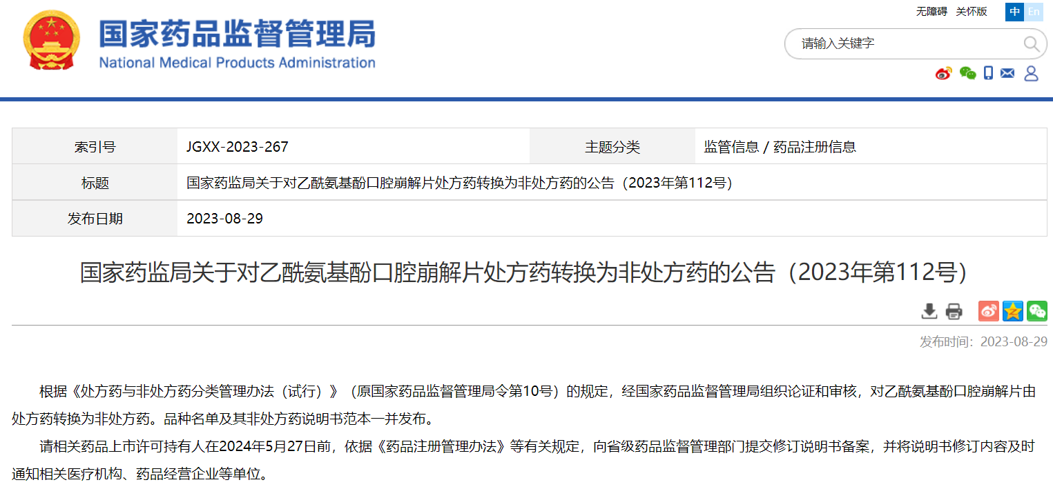 國家藥監(jiān)局關(guān)于對乙酰氨基酚口腔崩解片處方藥轉(zhuǎn)換為非處方藥的公告(2023年第112號)