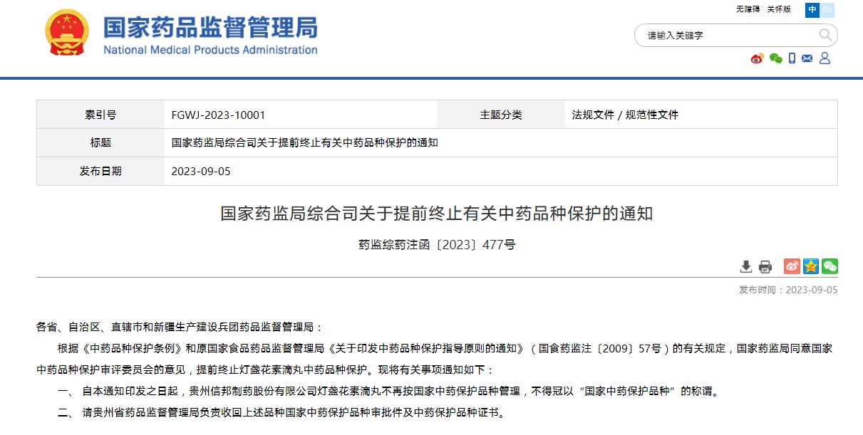 國家藥監(jiān)局綜合司關(guān)于提前終止有關(guān)中藥品種保護(hù)的通知