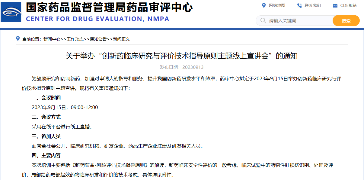 關(guān)于舉辦“創(chuàng)新藥臨床研究與評價(jià)技術(shù)指導(dǎo)原則主題線上宣講會”的通知