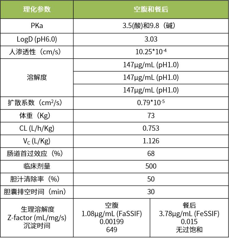 甲苯咪唑是一種口服藥物,具有中等親脂性,該化合物具有很強的pH依賴性,在酸性環(huán)境(pH 1.0)中溶解度為147μg/mL,在中性環(huán)境(pH 7.0)中溶解度為0.67 μg/mL,在堿性環(huán)境(pH 12.5)中溶解度為187 μg/mL,在空腹?fàn)顟B(tài)模擬腸液中測定的溶解度為1.08 mg/mL,在餐后狀態(tài)模擬腸液中測定的溶解度為3.78 mg/mL,該化合物的滲透率估計很高(Human Peff 10.25*10 ^4cm/s)導(dǎo)致BCS II分類,溶出模型選擇Z-factor模型。