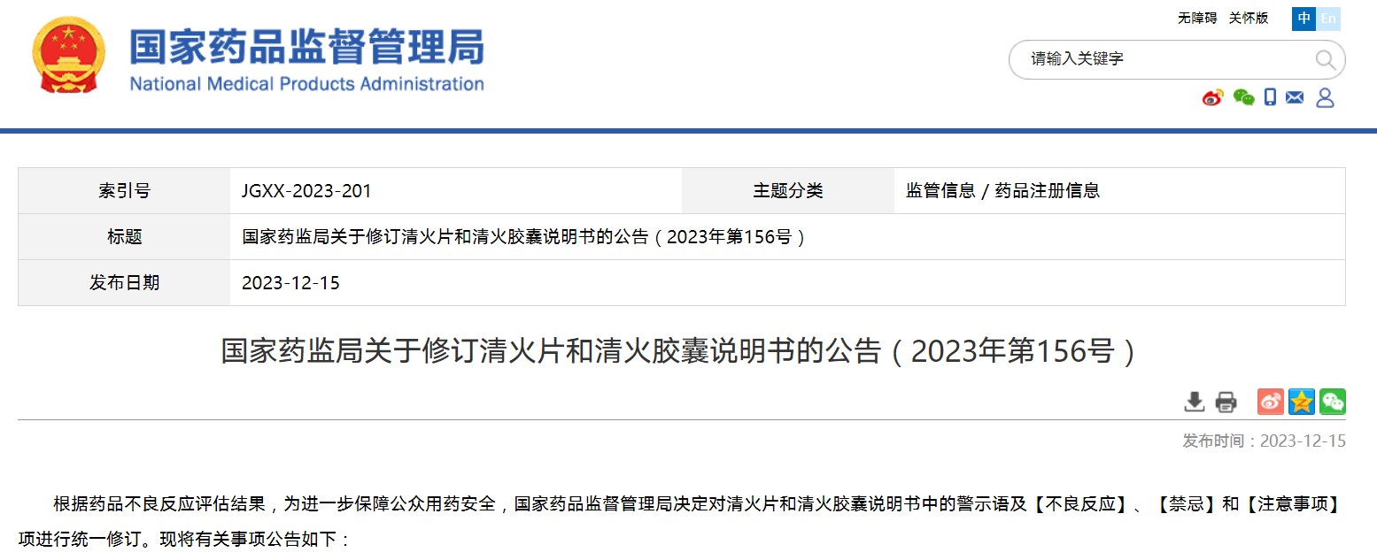 國家藥監(jiān)局關(guān)于修訂清火片和清火膠囊說明書的公告(2023年第156號)