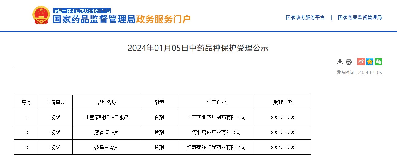 2024年01月05日中藥品種保護(hù)受理公示