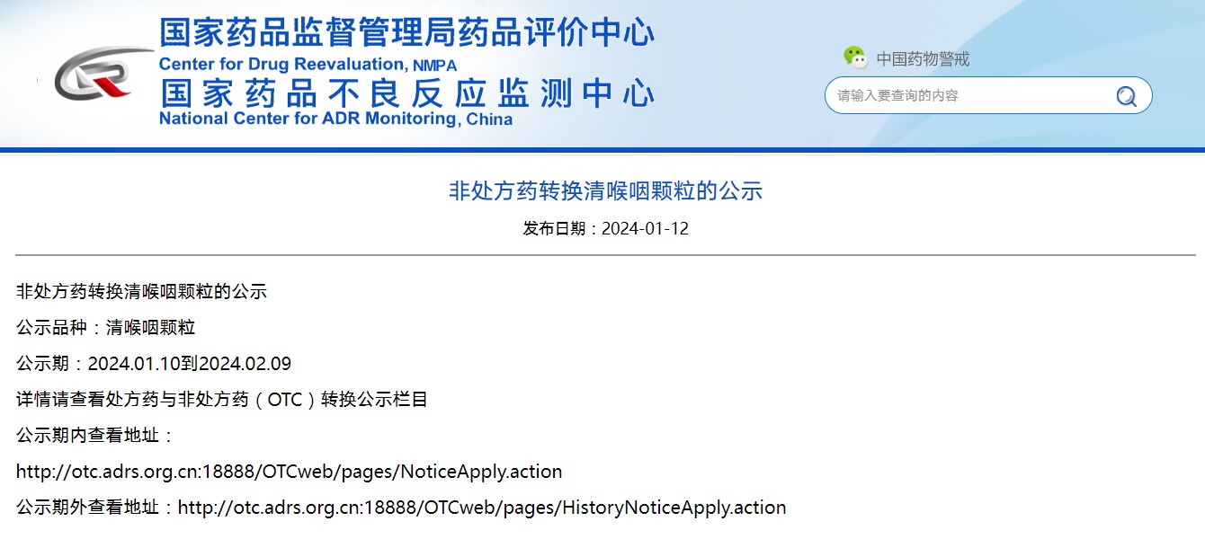非處方藥轉(zhuǎn)換清喉咽顆粒的公示