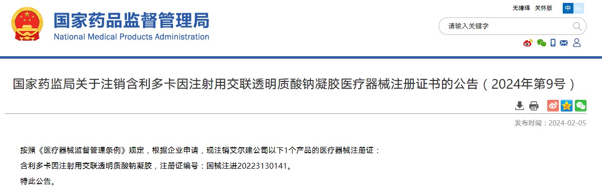 國(guó)家藥監(jiān)局關(guān)于注銷(xiāo)含利多卡因注射用交聯(lián)透明質(zhì)酸鈉凝膠醫(yī)療器械注冊(cè)證書(shū)的公告(2024年第9號(hào))