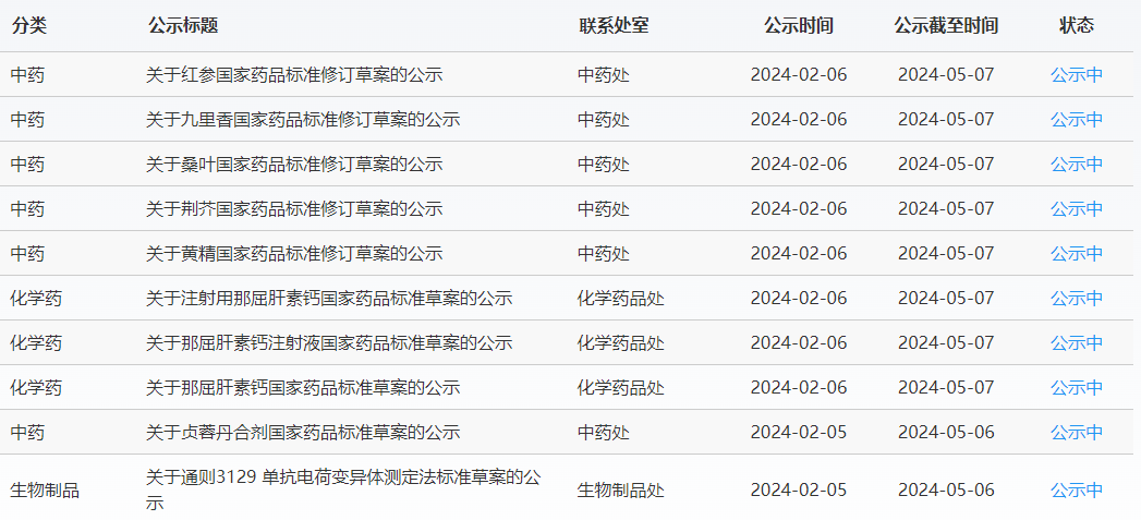 本周?chē)?guó)家藥典委共發(fā)布5個(gè)國(guó)家藥品標(biāo)準(zhǔn)草案的公示,5個(gè)國(guó)家藥品標(biāo)準(zhǔn)修訂草案的公示。
