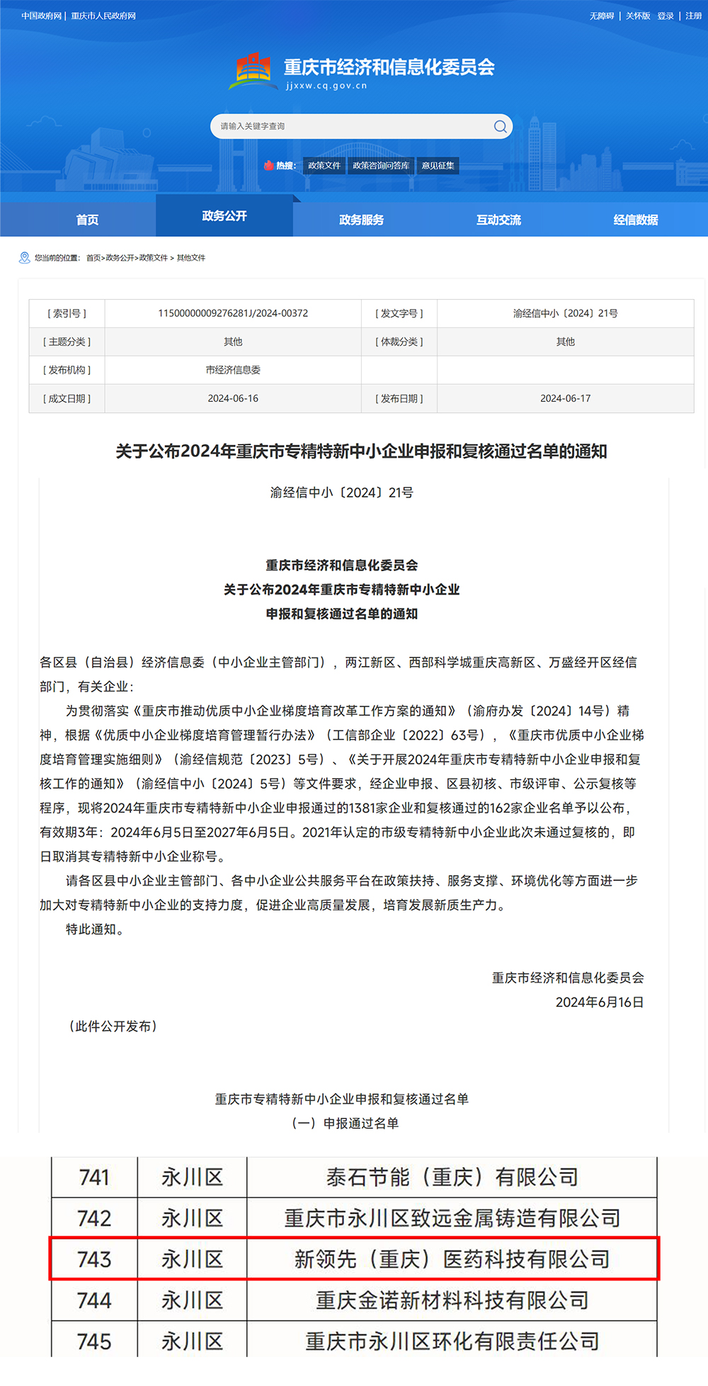 新領(lǐng)先(重慶)醫(yī)藥科技作為第一家落地永川的醫(yī)藥研發(fā)企業(yè),在永川區(qū)委區(qū)政府各級(jí)領(lǐng)導(dǎo)的大力支持下,不斷夯實(shí)藥學(xué)研究基礎(chǔ),提升技術(shù)水平,已開(kāi)展研發(fā)項(xiàng)目40余個(gè),其中包含11個(gè)改良型新藥項(xiàng)目(獲7個(gè)臨床批件),申報(bào)專(zhuān)利16項(xiàng),MAH獲得2個(gè)藥品生產(chǎn)許可B證,有近30個(gè)高端原料及制劑項(xiàng)目正在實(shí)驗(yàn)室如火如荼地推進(jìn)。高效完成質(zhì)量體系建設(shè)工作,2023年取得了ISO9001質(zhì)量管理體系認(rèn)證。產(chǎn)學(xué)研合作同步進(jìn)行,與重慶大學(xué)藥學(xué)院、重慶醫(yī)科大學(xué)附屬永川醫(yī)院達(dá)成戰(zhàn)略合作,“重慶大學(xué)藥學(xué)院研究生聯(lián)合培養(yǎng)基地“、”重慶大學(xué)藥學(xué)院實(shí)訓(xùn)基地”、“重慶大學(xué)藥學(xué)院大學(xué)生創(chuàng)業(yè)基地”、“新領(lǐng)先(重慶)&重慶醫(yī)科大學(xué)附屬永川醫(yī)院聯(lián)合研究中心”、“西部職教基地產(chǎn)教聯(lián)合體常務(wù)理事單位”等陸續(xù)掛牌。此次新領(lǐng)先(重慶)成功獲評(píng)重慶市“專(zhuān)精特新”中小企業(yè),是對(duì)公司專(zhuān)業(yè)化水平、創(chuàng)新能力以及發(fā)展?jié)摿Φ恼J(rèn)可。未來(lái),公司將繼續(xù)秉承“是我讓中國(guó)新藥技術(shù)和生產(chǎn)工藝與世界同步”的企業(yè)愿景,不斷加大科研創(chuàng)新投入,突破醫(yī)藥研發(fā)核心技術(shù),全面轉(zhuǎn)型升級(jí),助力新質(zhì)生產(chǎn)力發(fā)展!
