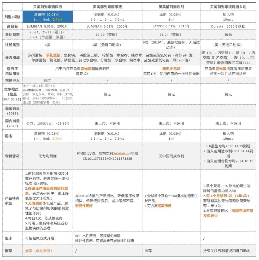 建議開發(fā)單劑量裝0.03%滴眼液、改善安全性的0.01%滴眼液、醫(yī)美涂劑,持續(xù)關(guān)注植入劑進(jìn)口動(dòng)向和專利情況。