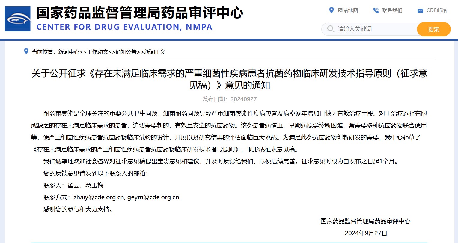 關(guān)于公開征求《存在未滿足臨床需求的嚴(yán)重細(xì)菌性疾病患者抗菌藥物臨床研發(fā)技術(shù)指導(dǎo)原則(征求意見稿)》意見的通知
