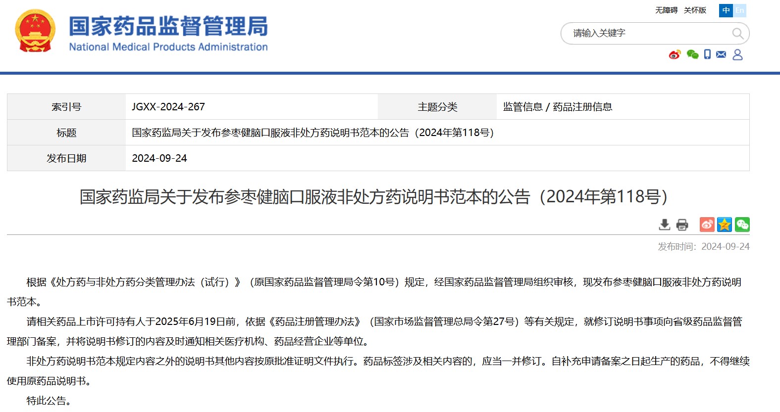 國家藥監(jiān)局關(guān)于發(fā)布參棗健腦口服液非處方藥說明書范本的公告(2024年第118號)