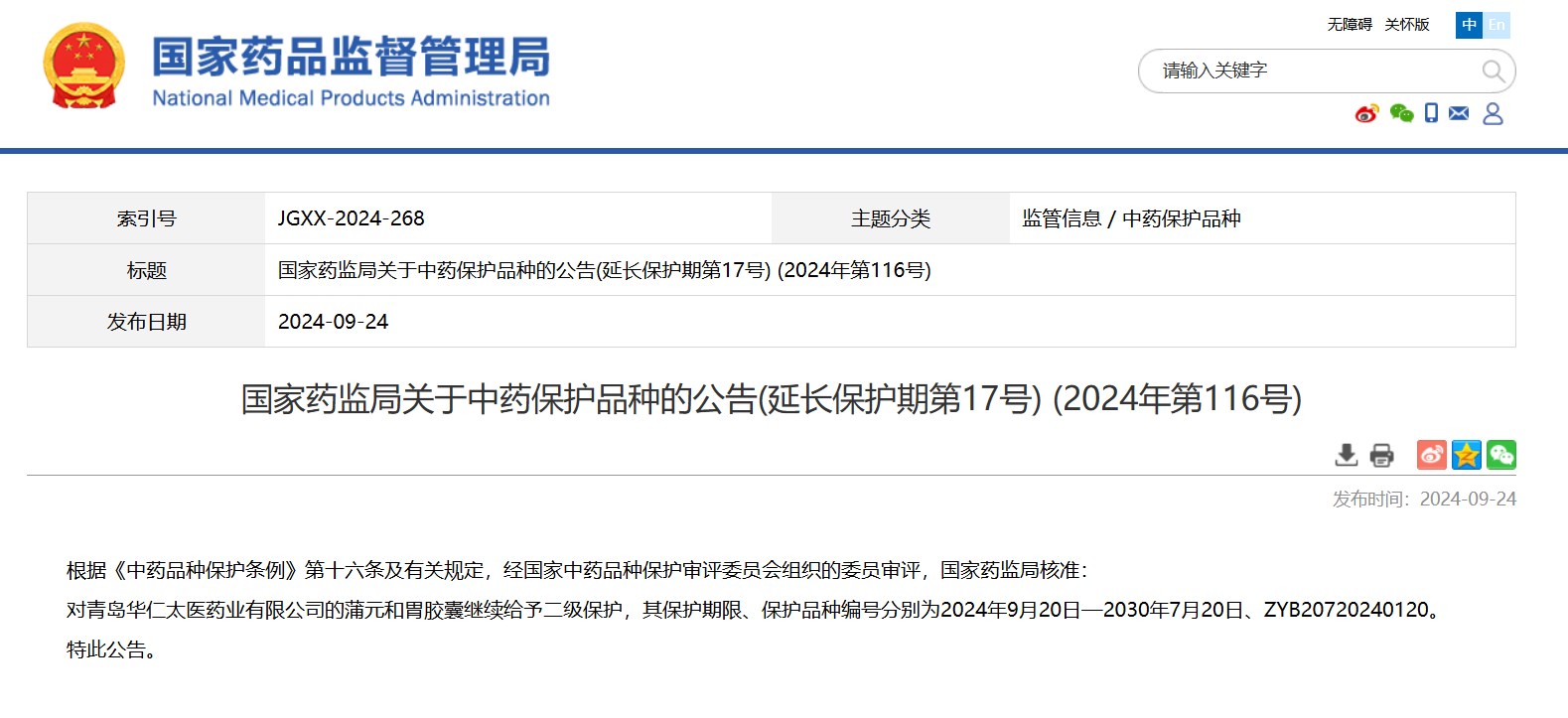 國家藥監(jiān)局關(guān)于中藥保護(hù)品種的公告(延長保護(hù)期第17號) (2024年第116號)