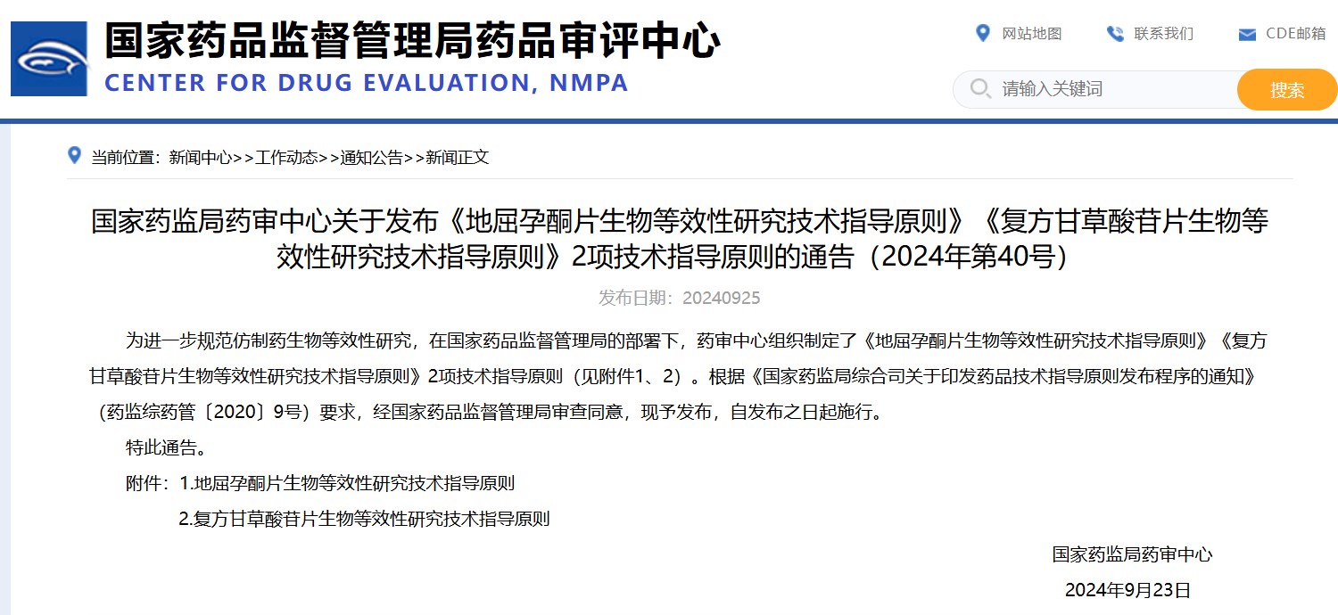 國家藥監(jiān)局藥審中心關(guān)于發(fā)布《地屈孕酮片生物等效性研究技術(shù)指導(dǎo)原則》《復(fù)方甘草酸苷片生物等效性研究技術(shù)指導(dǎo)原則》2項技術(shù)指導(dǎo)原則的通告(2024年第40號)