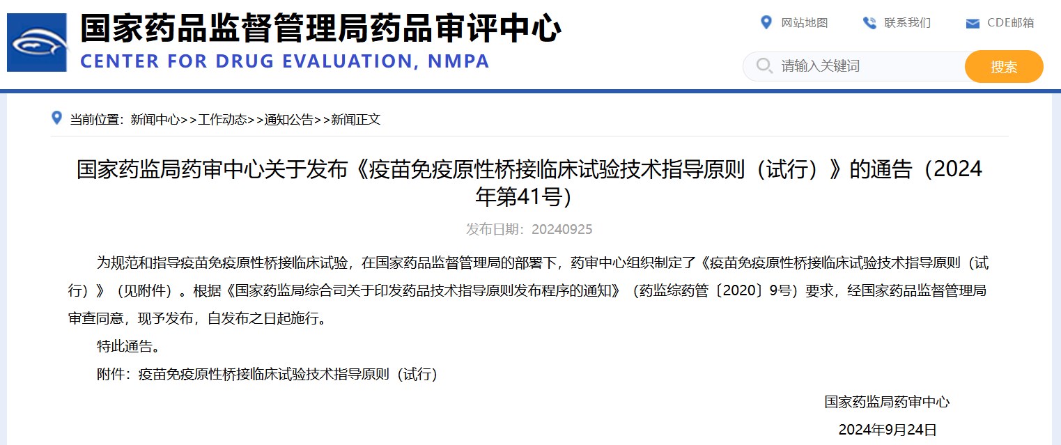 國家藥監(jiān)局藥審中心關(guān)于發(fā)布《疫苗免疫原性橋接臨床試驗技術(shù)指導(dǎo)原則(試行)》的通告(2024年第41號)