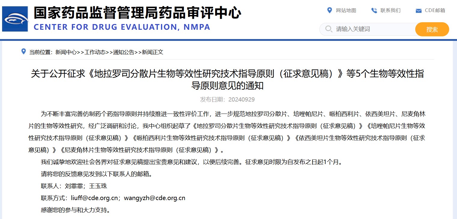 關(guān)于公開征求《地拉羅司分散片生物等效性研究技術(shù)指導(dǎo)原則(征求意見稿)》等5個生物等效性指導(dǎo)原則意見的通知