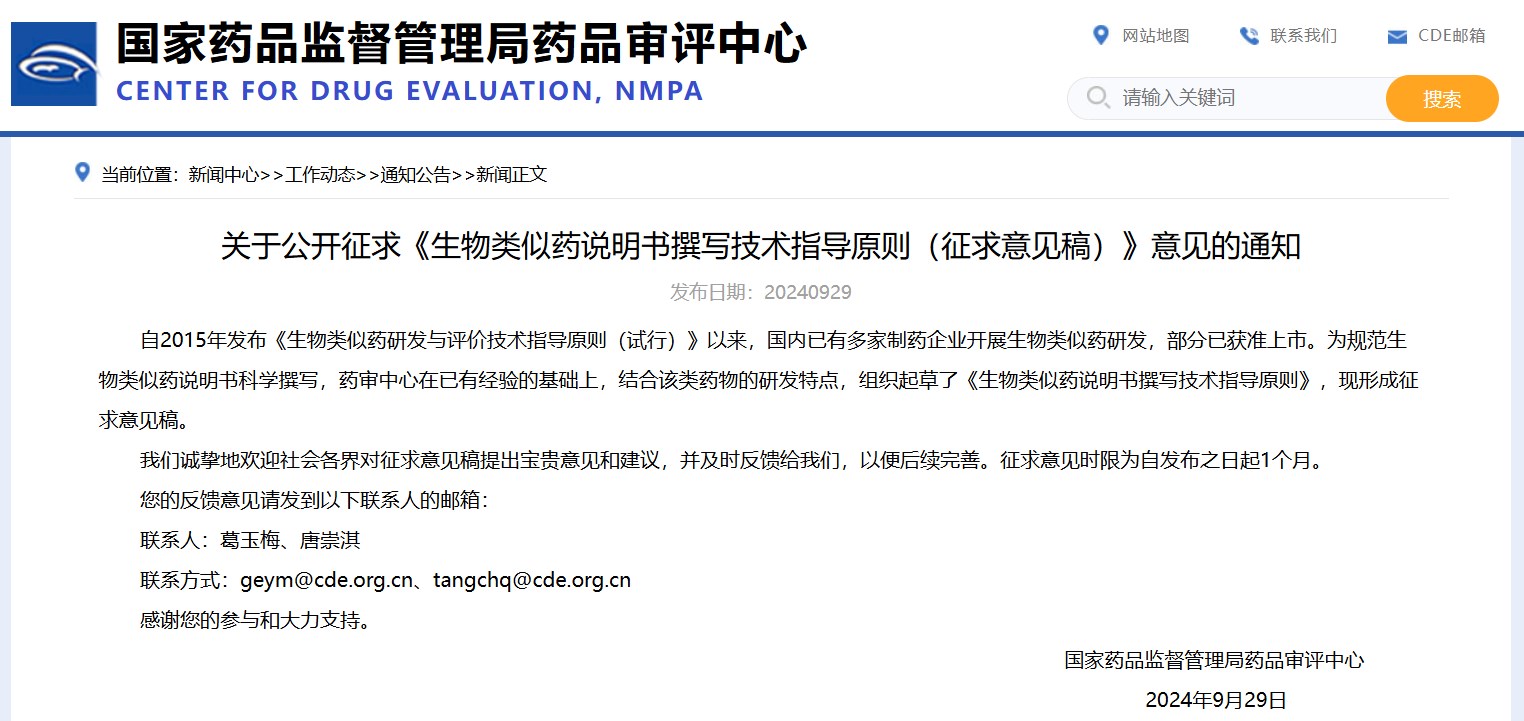 關(guān)于公開征求《生物類似藥說明書撰寫技術(shù)指導(dǎo)原則(征求意見稿)》意見的通知