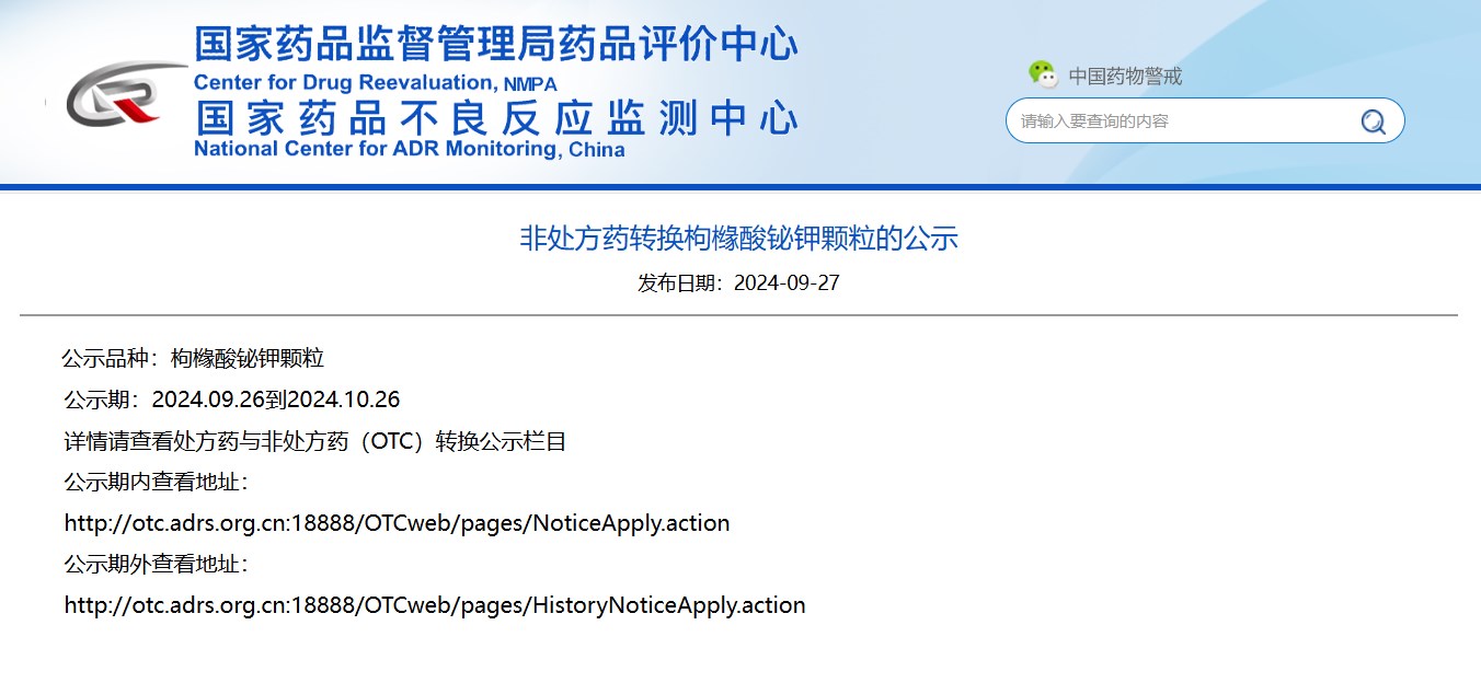 非處方藥轉(zhuǎn)換枸櫞酸鉍鉀顆粒的公示