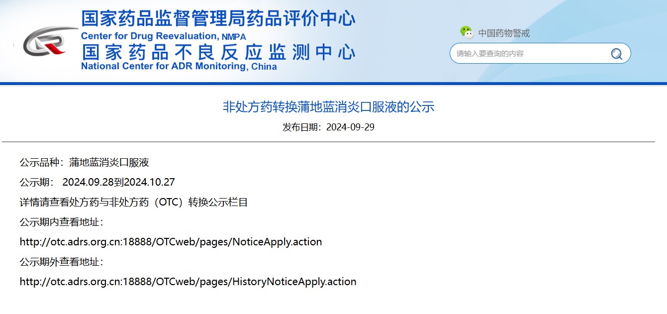 非處方藥轉(zhuǎn)換蒲地藍(lán)消炎口服液的公示