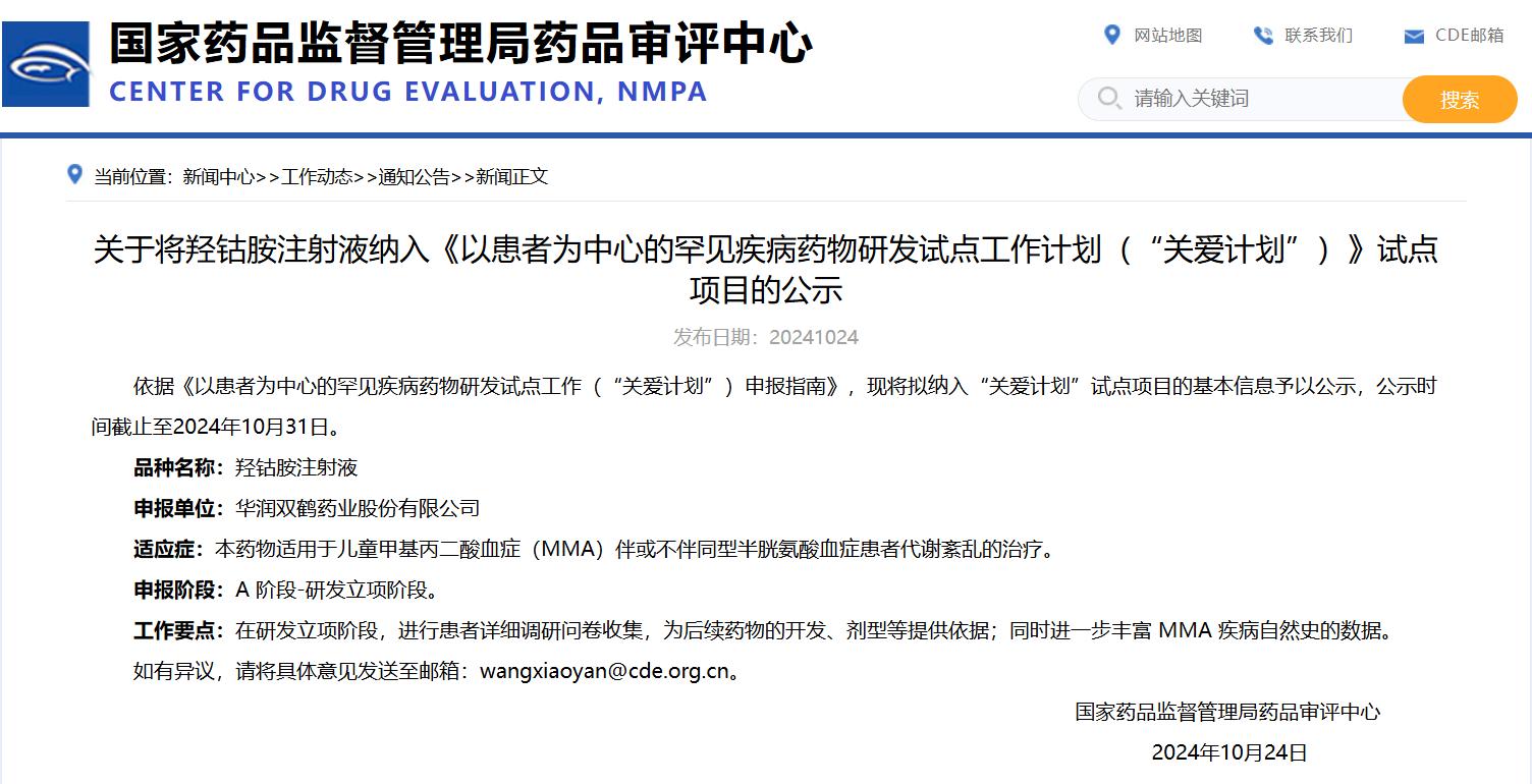 關(guān)于將羥鈷胺注射液納入《以患者為中心的罕見(jiàn)疾病藥物研發(fā)試點(diǎn)工作計(jì)劃(“關(guān)愛(ài)計(jì)劃”)》試點(diǎn)項(xiàng)目的公示