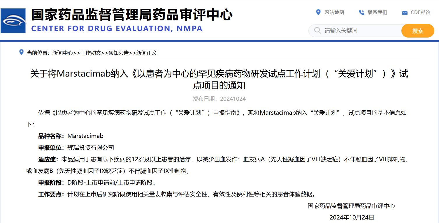 關(guān)于將Marstacimab納入《以患者為中心的罕見(jiàn)疾病藥物研發(fā)試點(diǎn)工作計(jì)劃(“關(guān)愛(ài)計(jì)劃”)》試點(diǎn)項(xiàng)目的通知