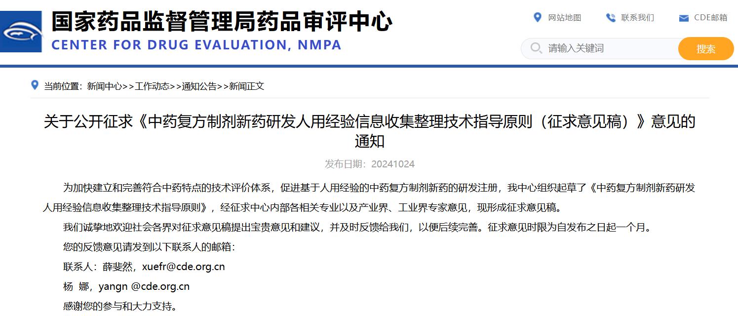 關(guān)于公開(kāi)征求《中藥復(fù)方制劑新藥研發(fā)人用經(jīng)驗(yàn)信息收集整理技術(shù)指導(dǎo)原則(征求意見(jiàn)稿)》意見(jiàn)的通知
