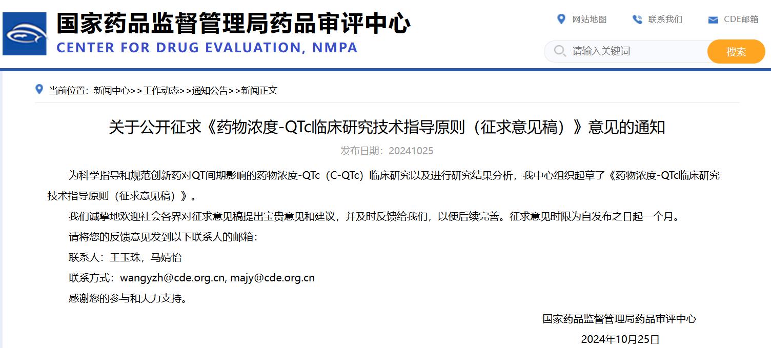 關(guān)于公開(kāi)征求《藥物濃度-QTc臨床研究技術(shù)指導(dǎo)原則(征求意見(jiàn)稿)》意見(jiàn)的通知