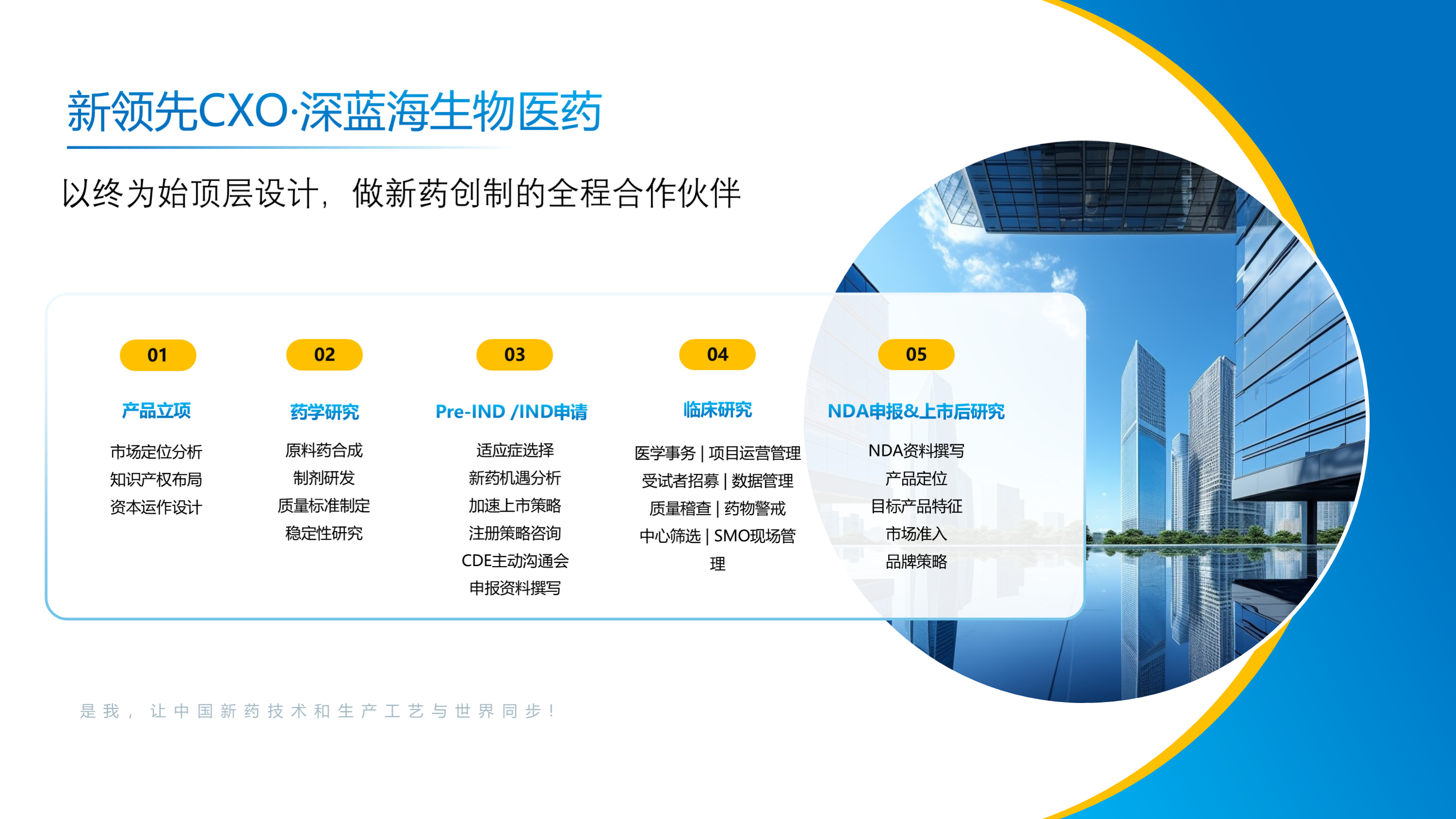 深藍海生物醫(yī)藥是新領先醫(yī)藥(股票代碼600222)在臨床CRO領域的子品牌,成立于2007年,秉持“以終為始,頂層設計,做新藥創(chuàng)制的全程合作伙伴”的服務理念,為全球藥企提供覆蓋生物藥、化藥、中藥、醫(yī)療器械、細胞與基因治療等I-III期臨床研究、生物等效性研究、上市后研究、第三方稽查、IND和NDA申報以及醫(yī)學事務等服務。可滿足不同研發(fā)型企業(yè)的臨床研究定制需求,為國內外客戶打通新藥上市前關鍵瓶頸。