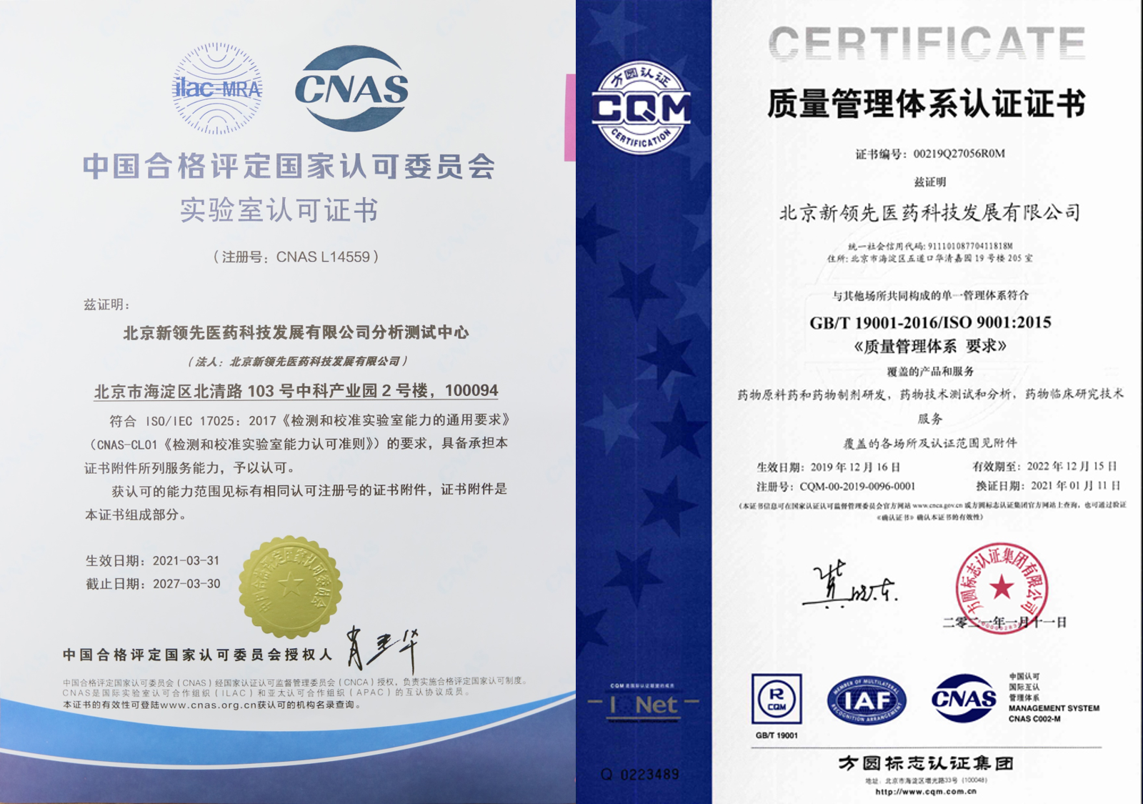 北京新領(lǐng)先醫(yī)藥科技發(fā)展有限公司分析測(cè)試中心面向國內(nèi)外藥企提供檢測(cè)技術(shù)服務(wù),積累了豐富的藥物質(zhì)量研究經(jīng)驗(yàn),主要提供痕量物質(zhì)如遺傳毒性雜質(zhì)、元素雜質(zhì)、殘留溶劑、聚合物雜質(zhì)、復(fù)雜制劑輔料剖析、藥品接觸系統(tǒng)相容性研究等符合NMPA、FDA、EMA等法規(guī)要求的研究檢測(cè)服務(wù)。本中心先后通過了ISO9001質(zhì)量管理體系認(rèn)證和中國合格評(píng)定國家認(rèn)可委員會(huì)(CNAS)實(shí)驗(yàn)室認(rèn)可資質(zhì)。