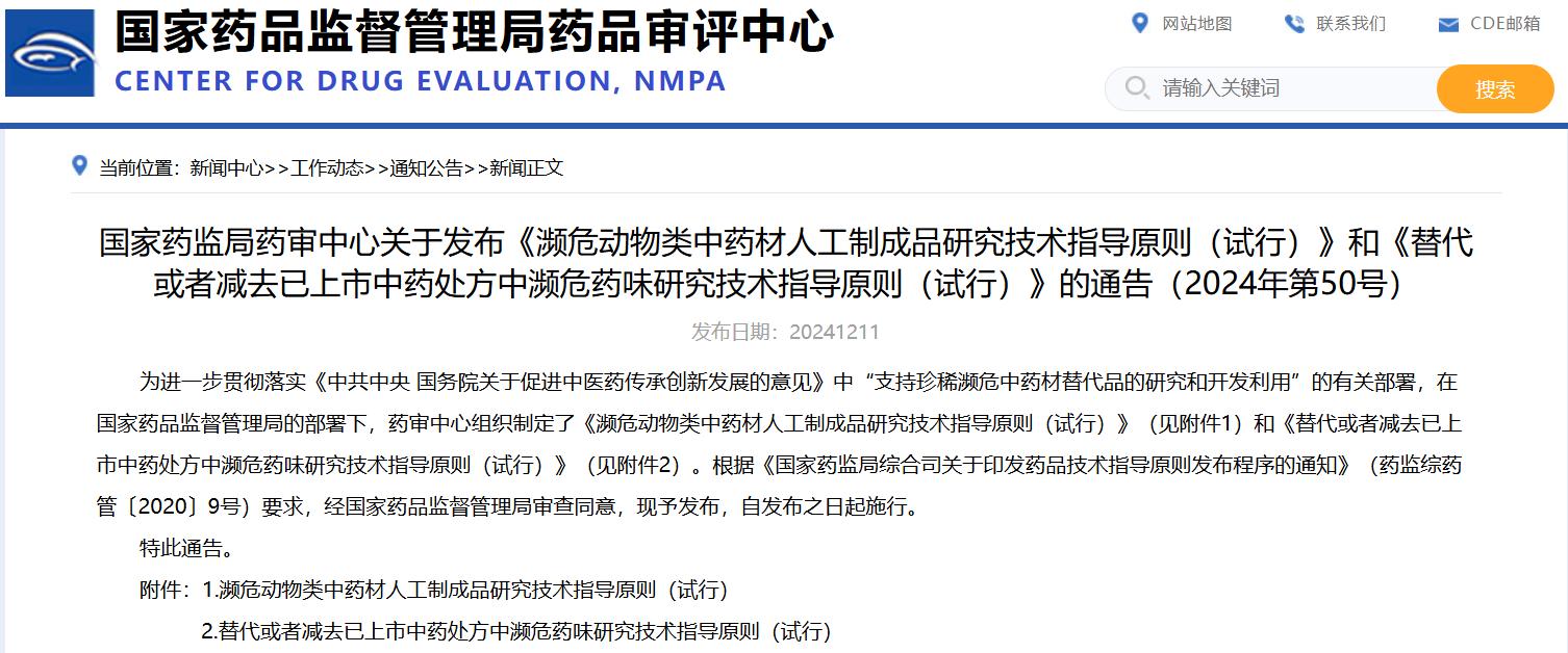國家藥監(jiān)局藥審中心關于發(fā)布《瀕危動物類中藥材人工制成品研究技術指導原則(試行)》和《替代或者減去已上市中藥處方中瀕危藥味研究技術指導原則(試行)》的通告(2024年第50號)