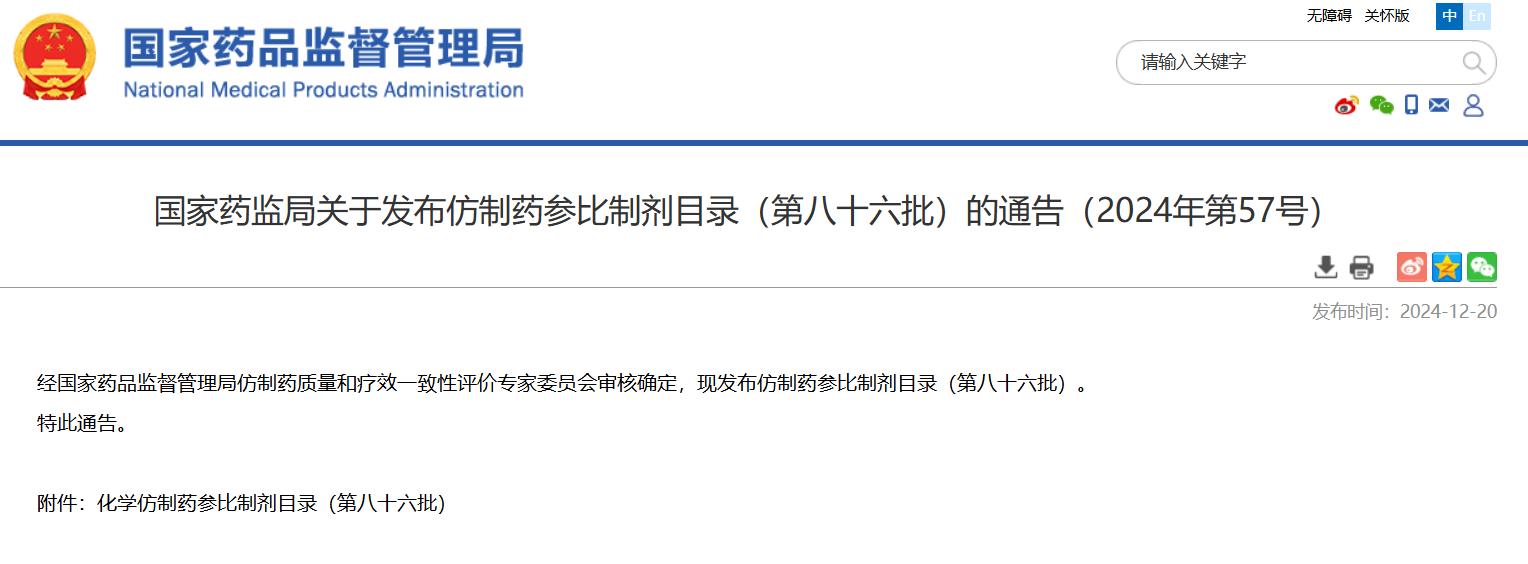 國家藥監(jiān)局關(guān)于發(fā)布仿制藥參比制劑目錄(第八十六批)的通告(2024年第57號(hào))