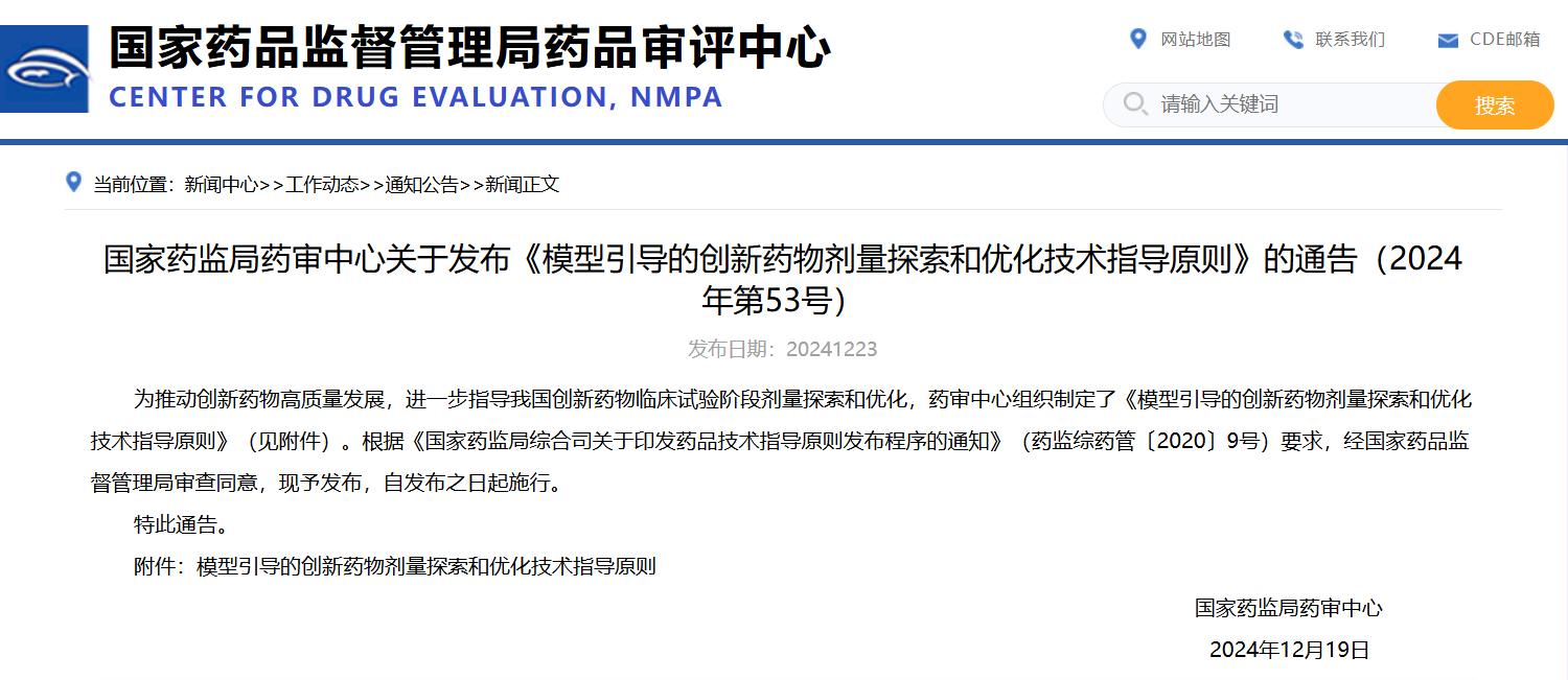 國家藥監(jiān)局藥審中心關(guān)于發(fā)布《模型引導(dǎo)的創(chuàng)新藥物劑量探索和優(yōu)化技術(shù)指導(dǎo)原則》的通告(2024年第53號)