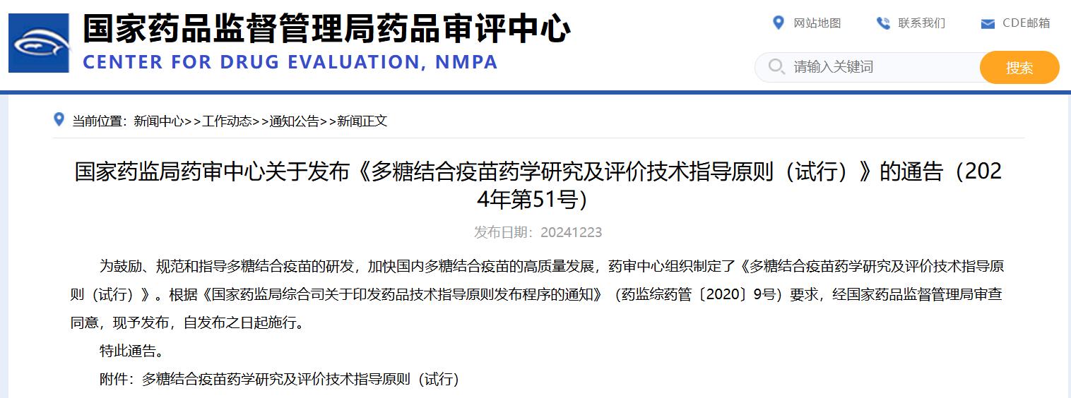 國家藥監(jiān)局藥審中心關(guān)于發(fā)布《多糖結(jié)合疫苗藥學(xué)研究及評價技術(shù)指導(dǎo)原則(試行)》的通告(2024年第51號)
