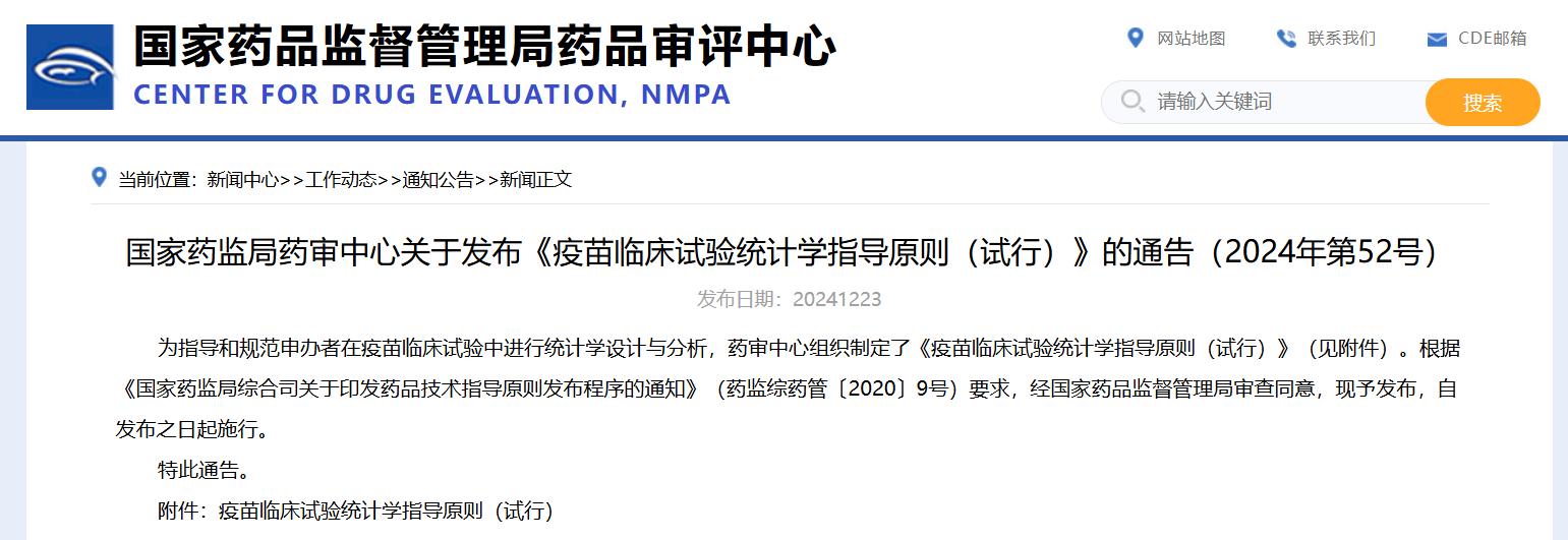 國家藥監(jiān)局藥審中心關(guān)于發(fā)布《疫苗臨床試驗(yàn)統(tǒng)計學(xué)指導(dǎo)原則(試行)》的通告(2024年第52號)