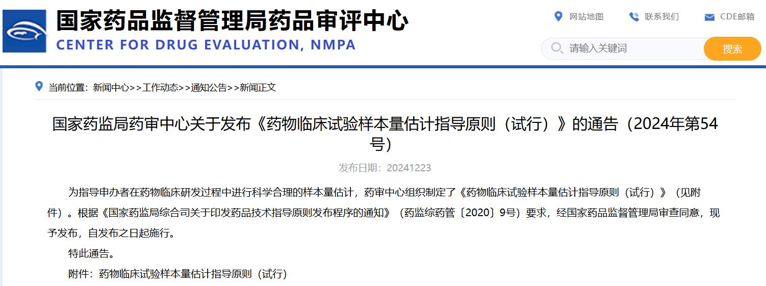 國家藥監(jiān)局藥審中心關(guān)于發(fā)布《藥物臨床試驗(yàn)樣本量估計指導(dǎo)原則(試行)》的通告(2024年第54號)