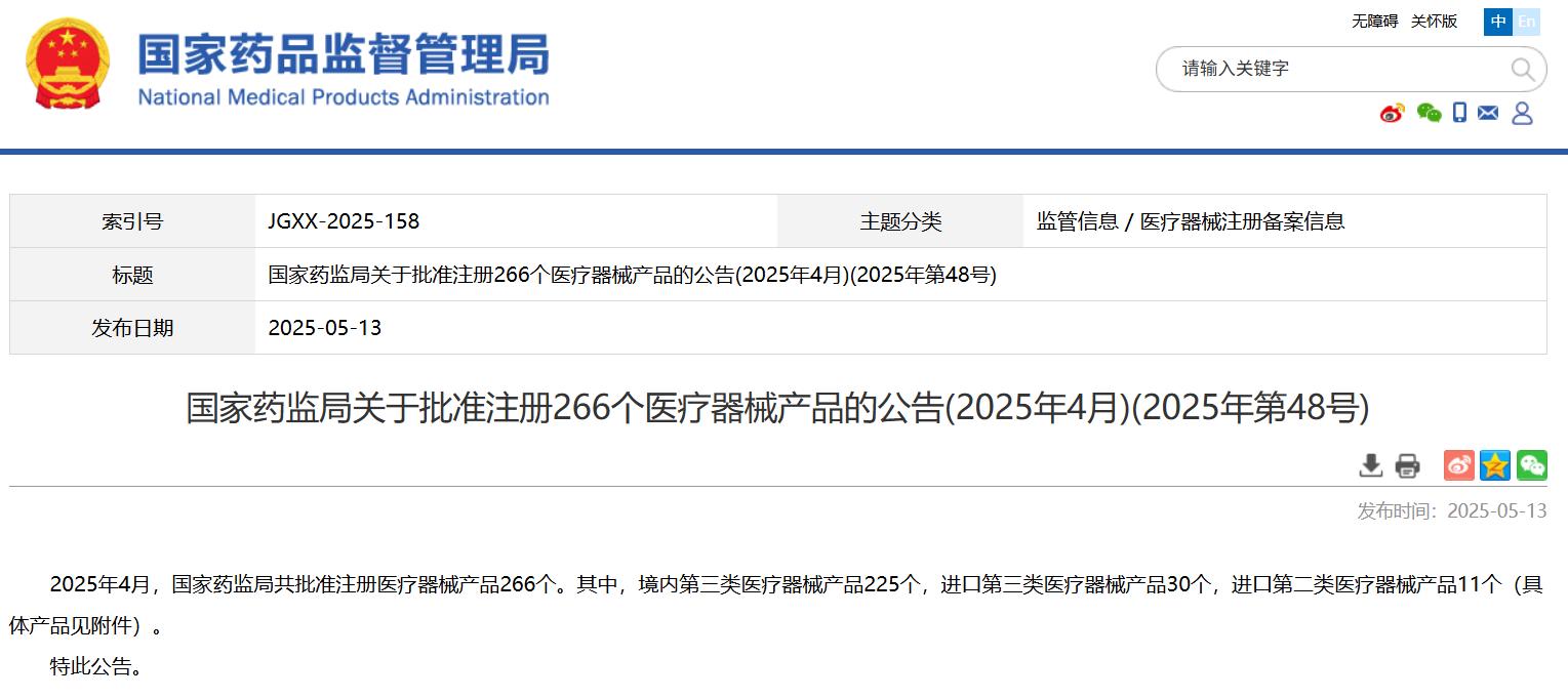 國家藥監(jiān)局關(guān)于批準(zhǔn)注冊266個醫(yī)療器械產(chǎn)品的公告(2025年4月)(2025年第48號)