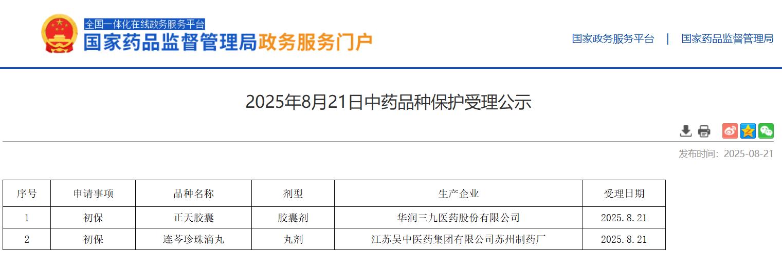 2025年8月21日中藥品種保護受理公示