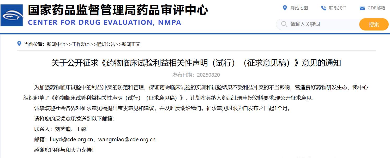 關(guān)于公開征求《藥物臨床試驗利益相關(guān)性聲明(試行)(征求意見稿)》意見的通知