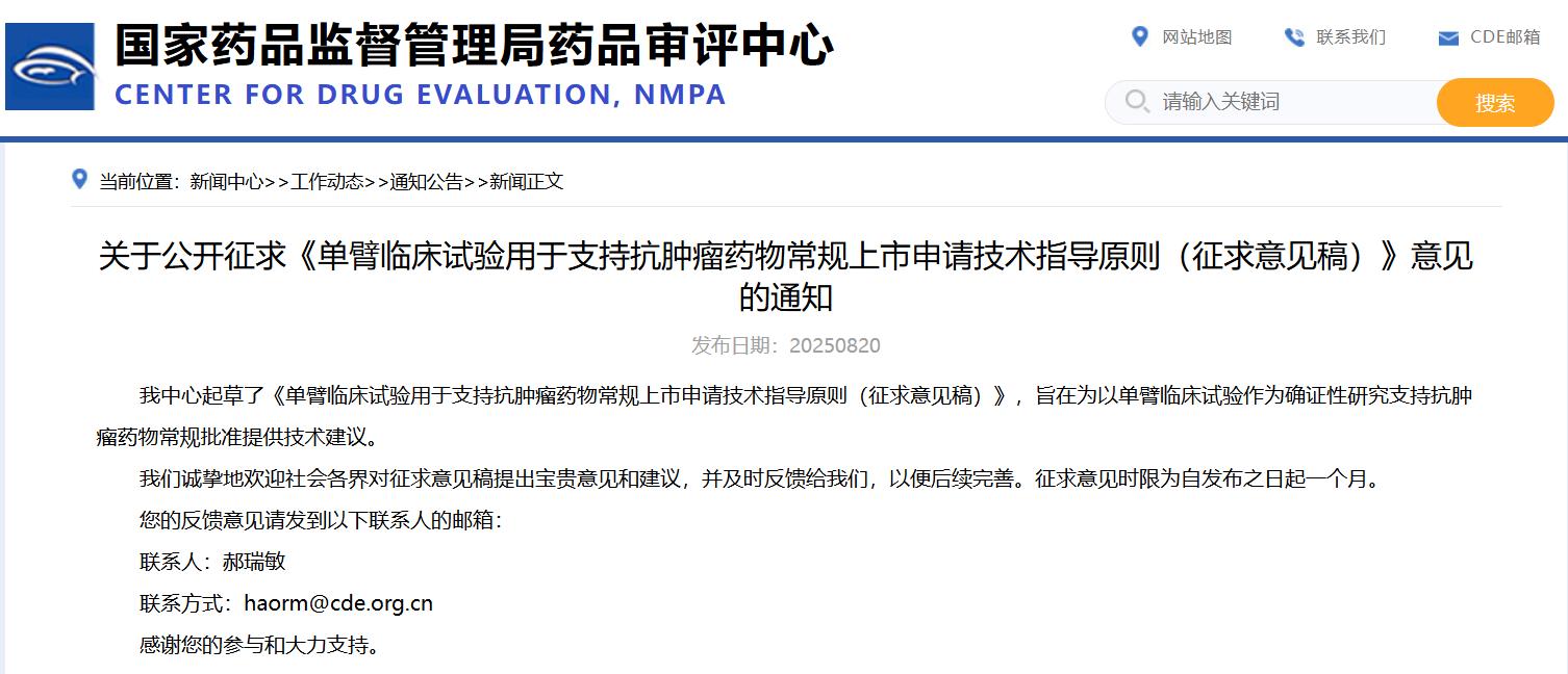 關(guān)于公開征求《單臂臨床試驗用于支持抗腫瘤藥物常規(guī)上市申請技術(shù)指導原則(征求意見稿)》意見的通知